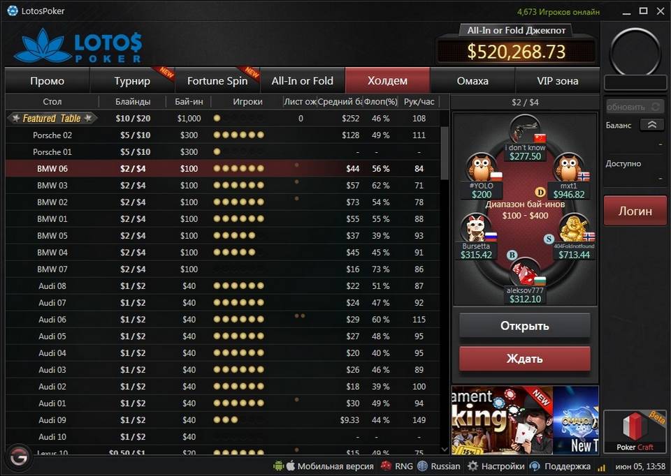В своем арсенале LotosPoker имеет широкий выбор покерных дисциплин разного рода вариаций. Кроме привычных кэш-игр и турниров по безлимитному холдему или омахе, в руме есть несколько трендовых новинок: столы All-in or Fold, опции RITT (Run It Three Times), страховка ва-банка на кеш-столах и другие.