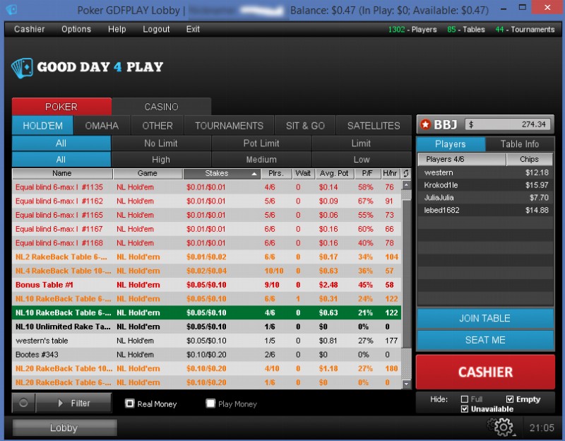 После регистрации все новые игроки получают доступ к столам для новичков. Игра на этих столах ведется в течение 120 дней с момента регистрации. Эта опция позволяет новым пользователям GoodDayForPlay.com ознакомиться с сайтом, не сталкиваясь с более опытными игроками. Столы для новичков отображаются в зеленом цвете. В то же время вы сможете играть и за обычными столами.
