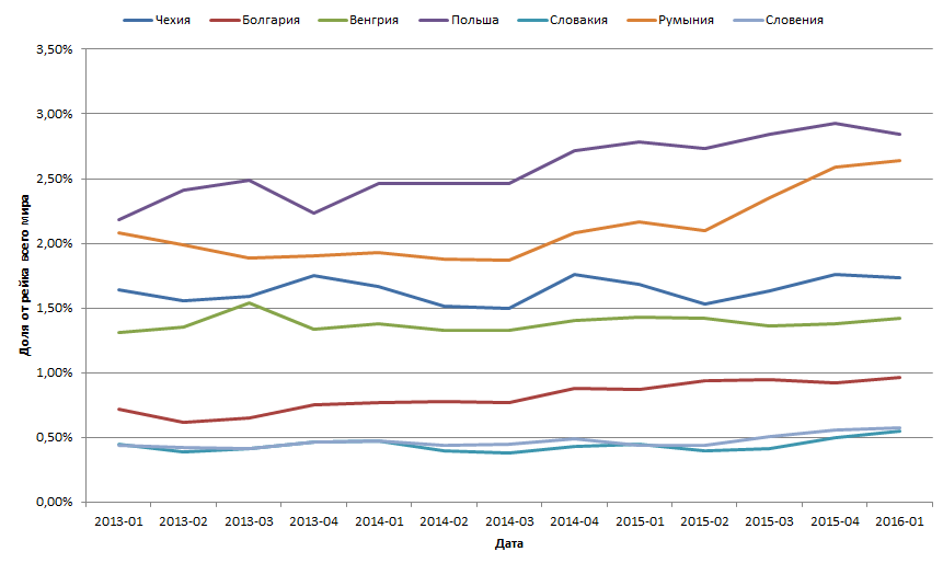 В странах восточной Европы в последние годы трафик онлайн-покера стабильно рос. В среднем он поднялся примерно на 16%, а общая доля стран увеличилась с 8.83% в начале 2013-го до 10.5% в начале 2016-го. Успехи Доминика Паньки вдохновили игроков из Польши: их доля выросли с 2.2% до 2.8%.