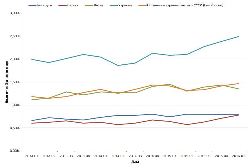 Как мы видим из графика, Латвия, совершив за год большой скачок, уже почти догнала Беларусь по трафику.