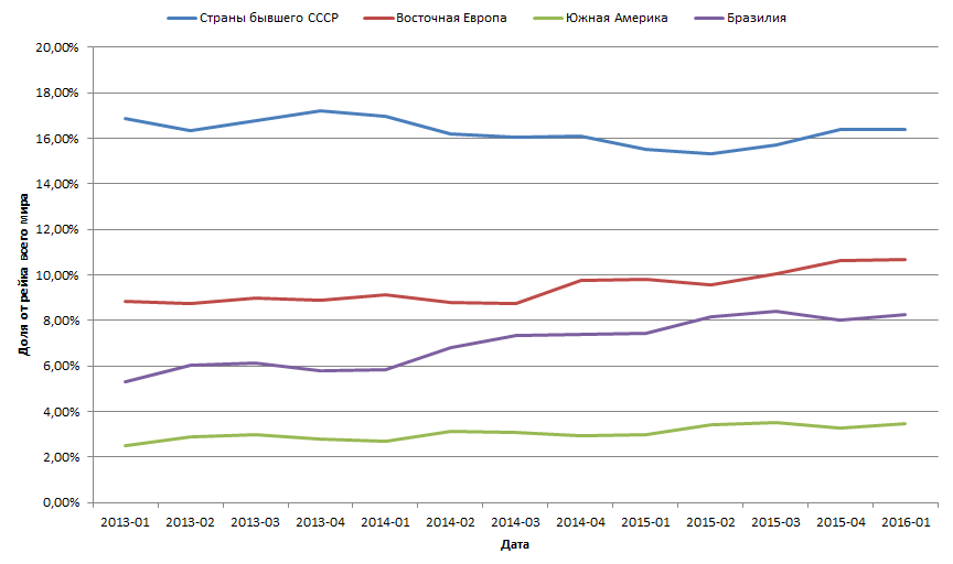 Другие страны Южной Америки также показывают значительный рост трафика. В среднем их общая доля в начале 2013-го составляла 2.53%, в 2015-м – 3.01%, а в этом году – уже 3.48%.