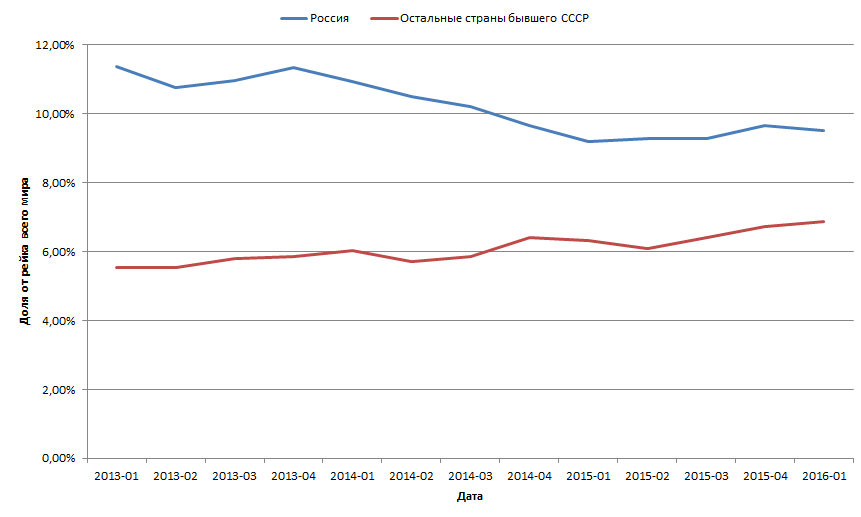 - В Германии трафик серьезно падает: с внушительных 10.08% в 2013-м немцы спустились до все равно внушительных, но уже не таких впечатляющих 8.77%.