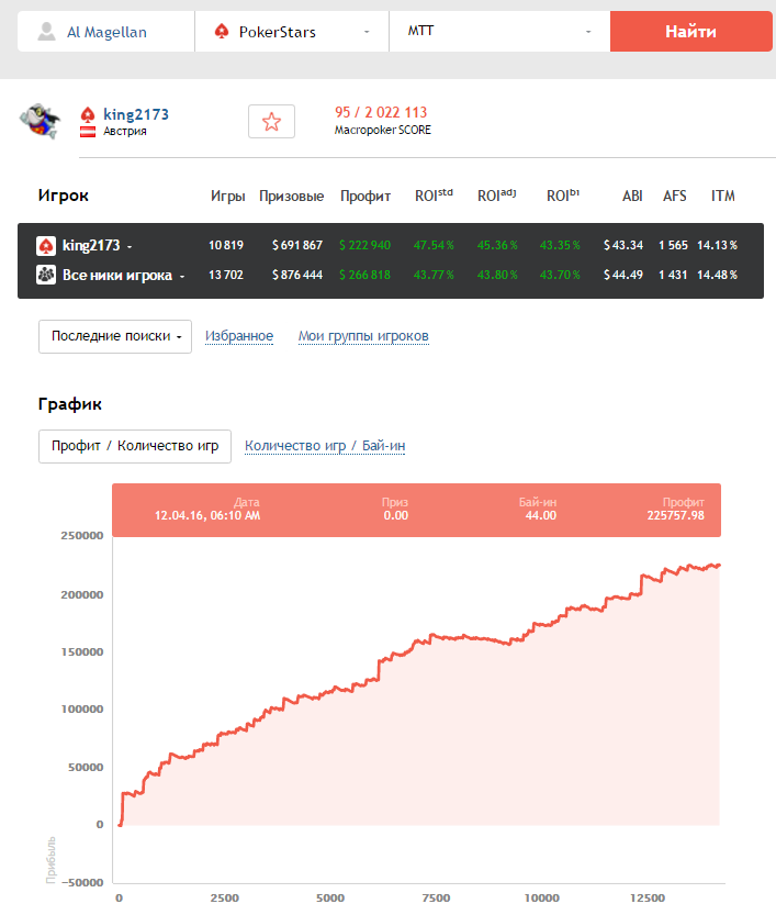Интересно, что ROI выше 40% из всех сыгравших 3000 МТТ и более на средних лимитах имеют всего 189 человек (большинство из которых получили такой ROI благодаря одному крупному заносу), а на дистанции в 10 000+ турниров – всего трое: украинец Александр “Al Magellan” Носов, австриец king2173 и португалец Руй “RuiNF” Феррейра. Вот график одного из них: