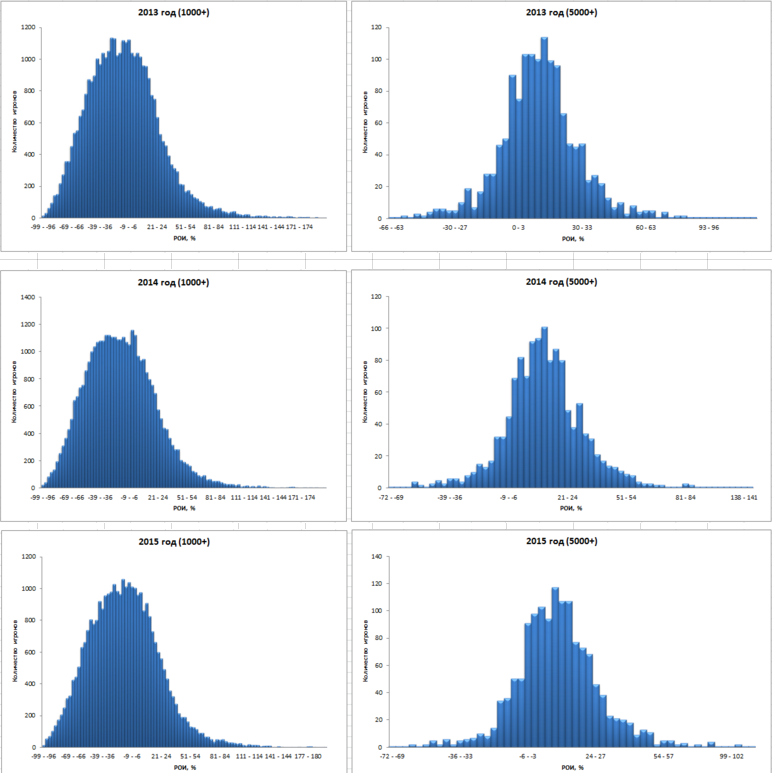 Для каждого года мы построили по две гистограммы, показывающие, как распределяются игроки МТТ по ROI на дистанциях в 1000+ турниров и 5000+ покерных турниров. Видно, что за прошедшие три года гистограммы сместились влево, то есть в сторону минусового ROI. В связи с усилением поля и изменением призовой структуры турниров (доля нокаут-турниров сильно выросла) больше игроков стали играть в ноль или минус, а прибыли выигрывающих регуляров сократились.