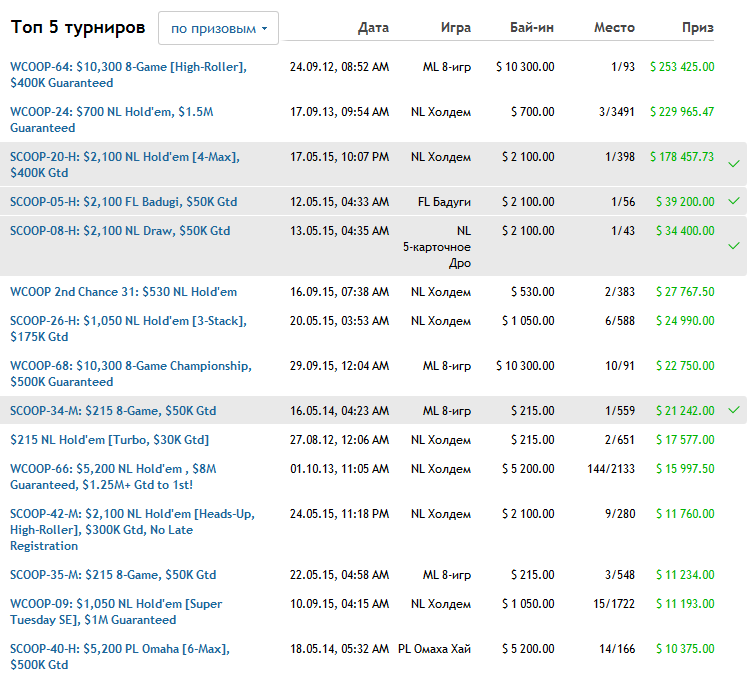 Самыми расточительными игроками трех сезонов SCOOP стали Талал «raidalot» Шакерчи и Владимир «vovtroy» Трояновский – оба потратили на бай-ины по $350k. При этом англичанин сыграл на полсотни покерных турниров меньше, чем россиянин (293 против 342) – просто особо не разменивался на бай-ины ниже категории High. По итогам оба в минусе, но в небольшом и с приключениями: Шакерчи в 2014-м выиграл ребайник по $1k ($169k), а Трояновский в прошлом году занял 2 место в последнем ивенте серии, турбине по $1k ($187k). Также у Вовтроя есть браслет за турнир по Стаду за $2100 – он выиграл его в 2014-м и получил $36k.