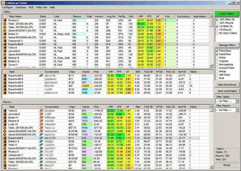 Table Scan Turbo – это покерная программа для поиска прибыльных столов по определенным критериям. С её помощью вы можете найти столы с самыми слабыми соперниками и заработать больше денег.