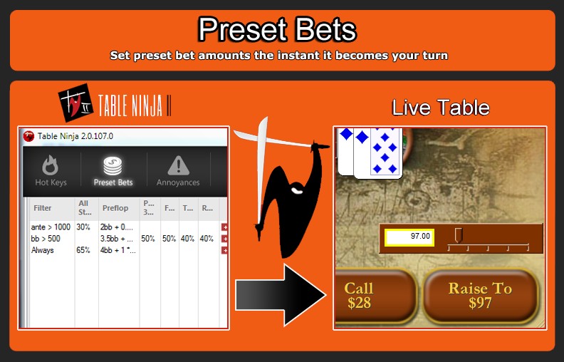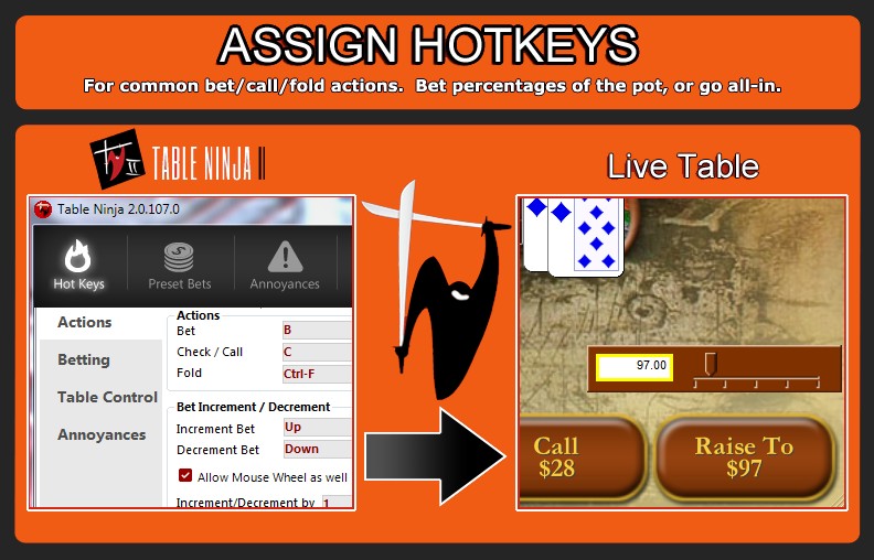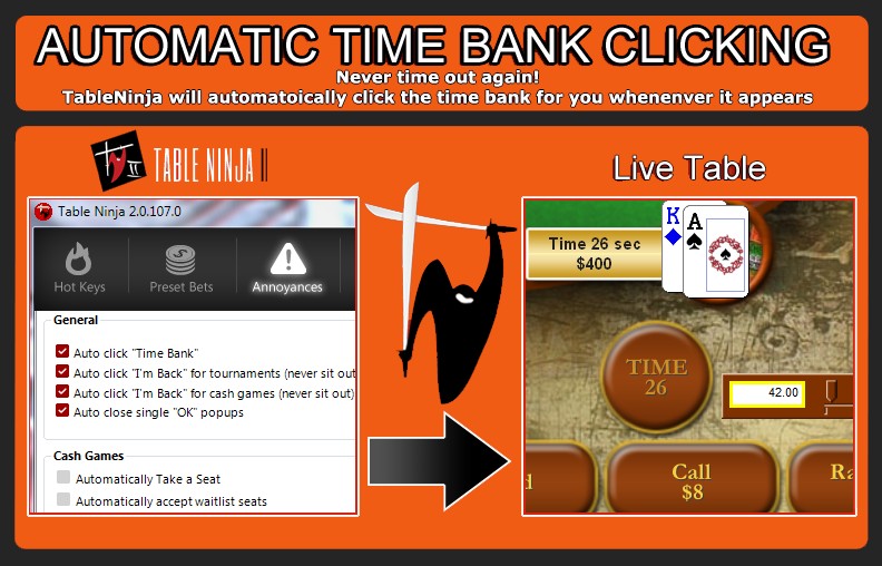 C Table Ninja 2 вам больше не придется кликать мышкой, чтобы активировать стол. Достаточно подвести курсор к нужному столу и можно будет совершить любое действие с помощью клавиатуры. Также в программе предусмотрено множество настроек для автоматизации ходов.